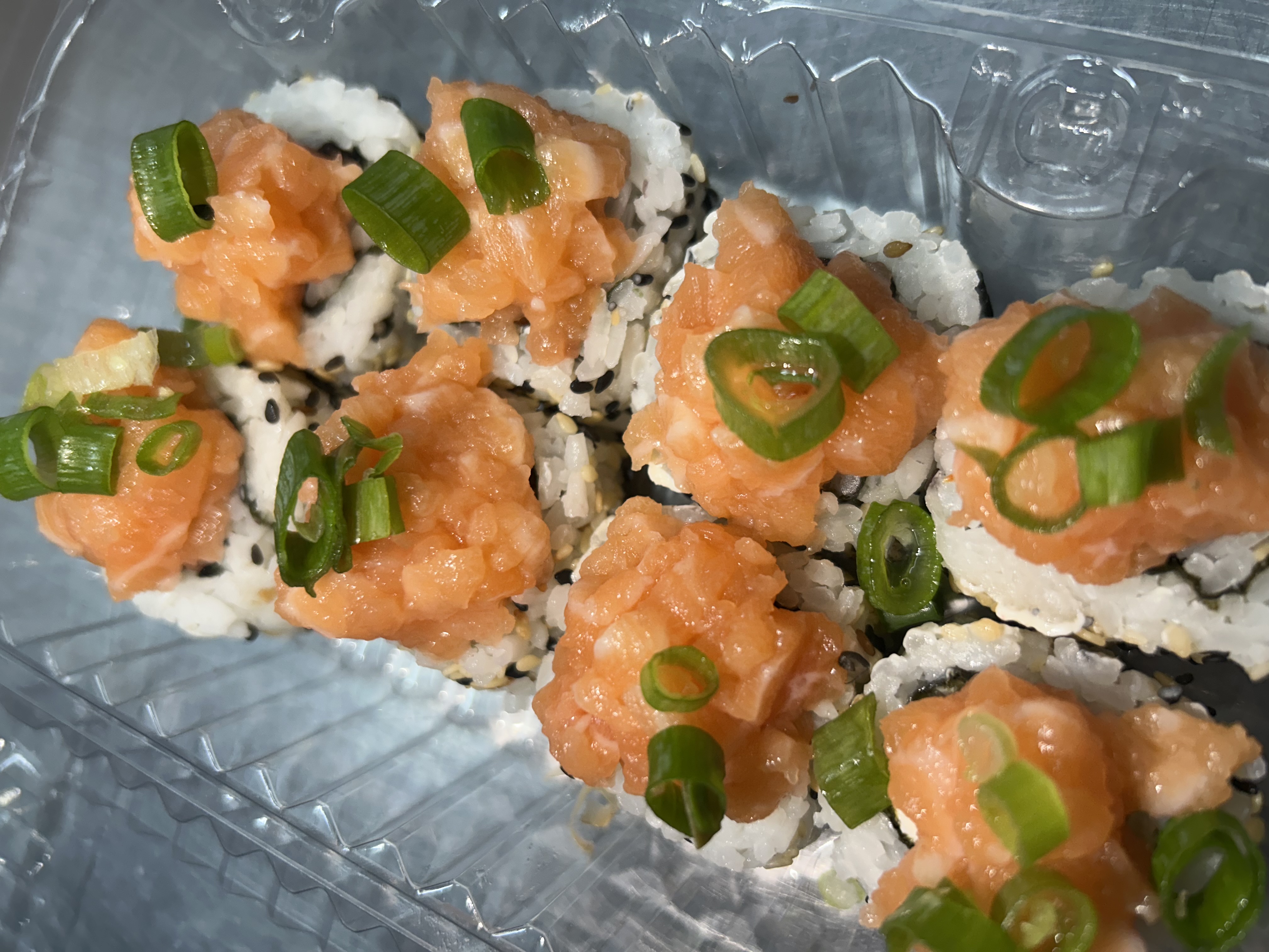 Uramaki de Salmão com salmão batido em cima com cebolinha!! 8 unidades