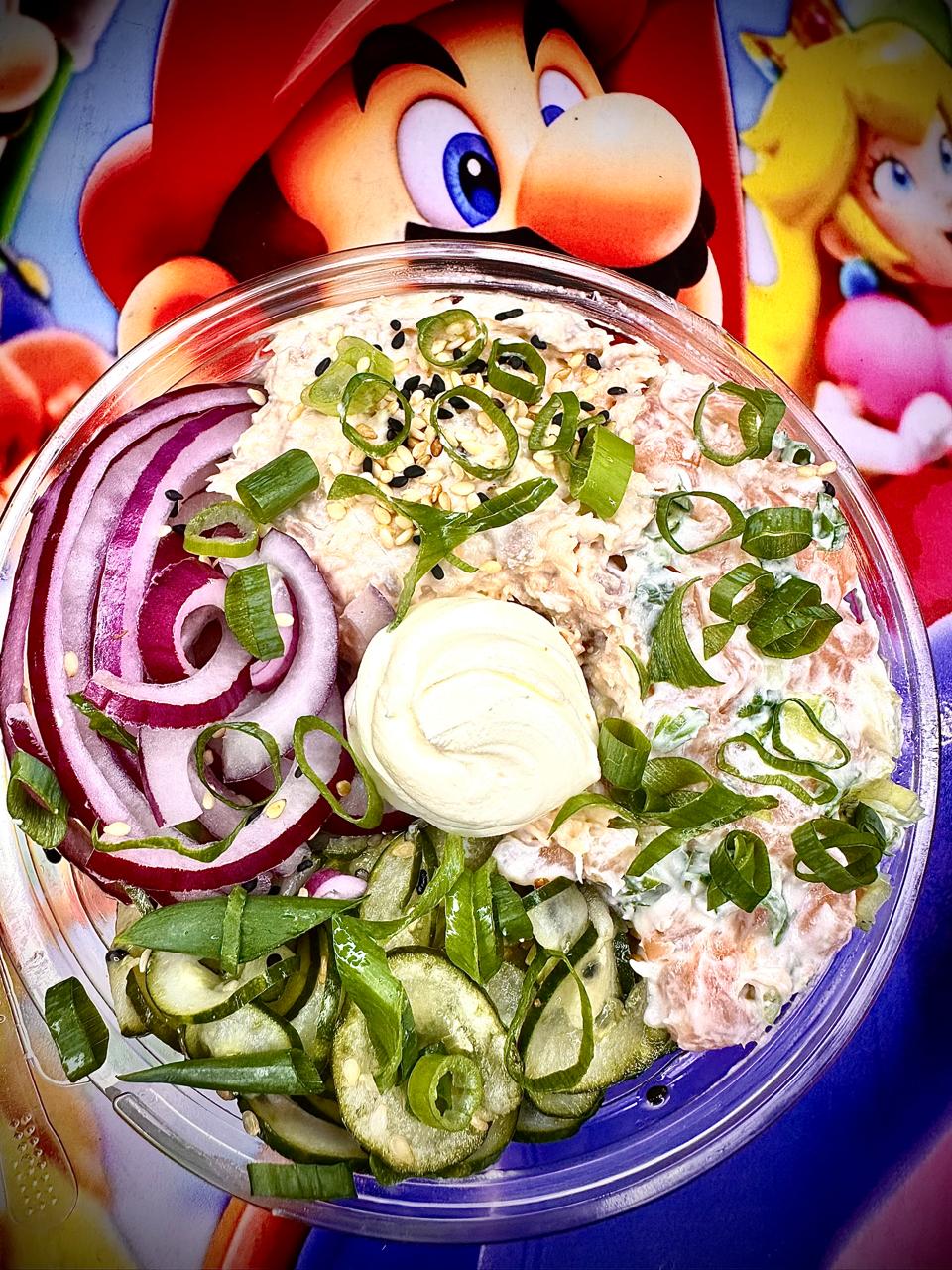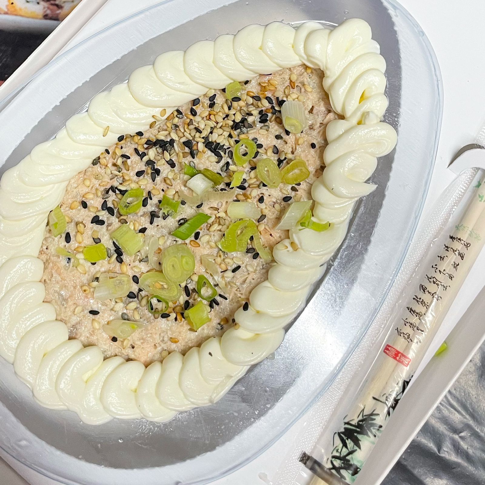 Arroz gohan, salmão grelhado desfiado com cream cheese, manda, kani, cebola roxa, cebolinha e gergelim.