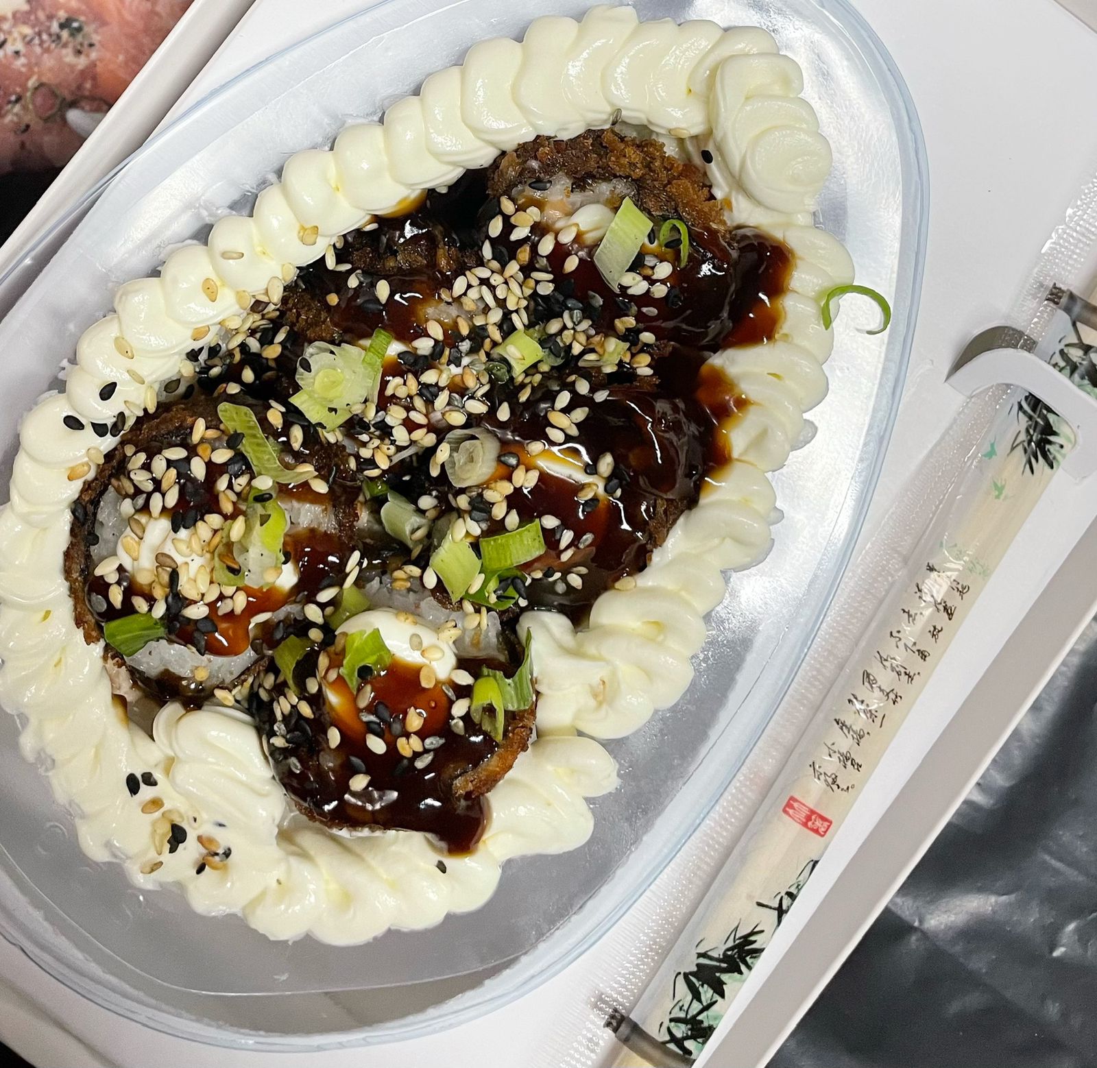 Hot rolls fritos, sendo 10 unidades. Os hot rolls acompanham a finalização com: cream cheese, cebolinha, gergelim e molho tarê :)