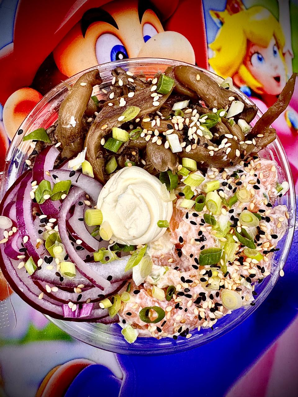 Arroz gohan, shimeji ao molho shoyo frito na manteiga, salmão em cubos com cream cheese e cebolinha, cebola roxa, cebolinha e gergelim.