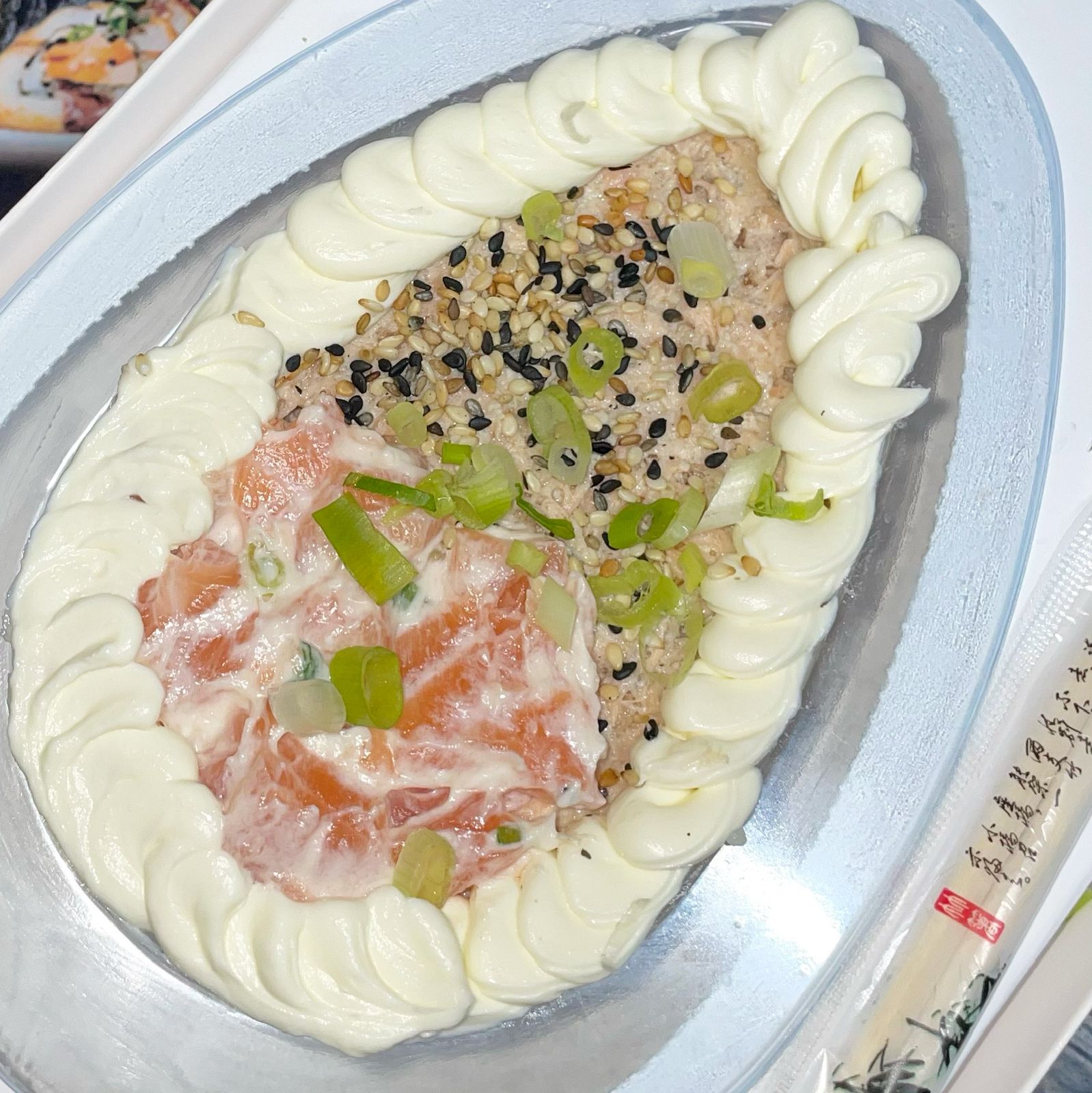 O hot inteiro de salmão acompanha a finalização caprichada de: cream cheese, cebolinha, gergelim e molho tarê :)